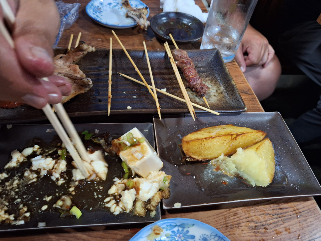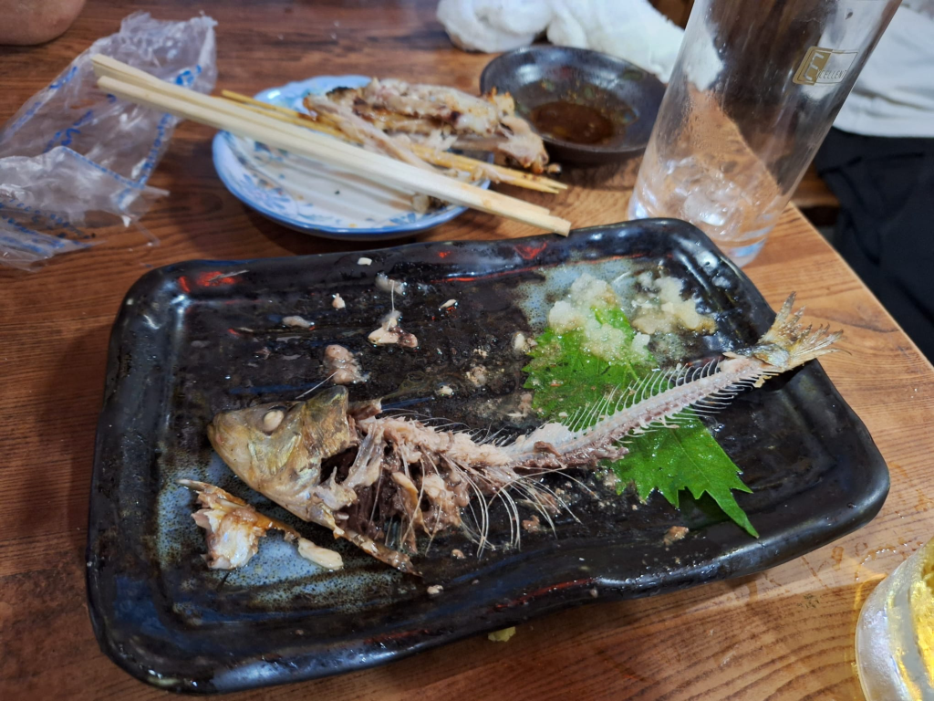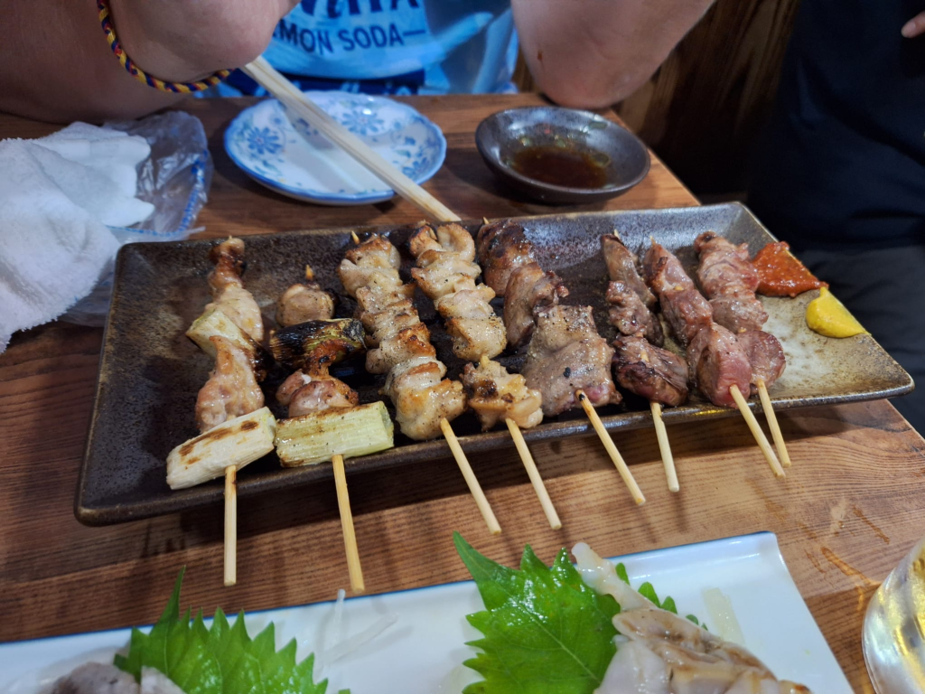 Wir beginnen mit einem Laden für Yakitori, Grillspieße. M. bestellt eine große Auswahl (wie eigentlich immer), ich bestelle, was ich auf der Karte lesen kann und meinem Magen guttut: Hühnchen, Herz vom Huhn, Magen, auch Zunge gibt es. Ich weiß nicht mehr, von welchem Tier. Und Sashimi, rohen Fisch. Sehr gesund, da der Reis fehlt.