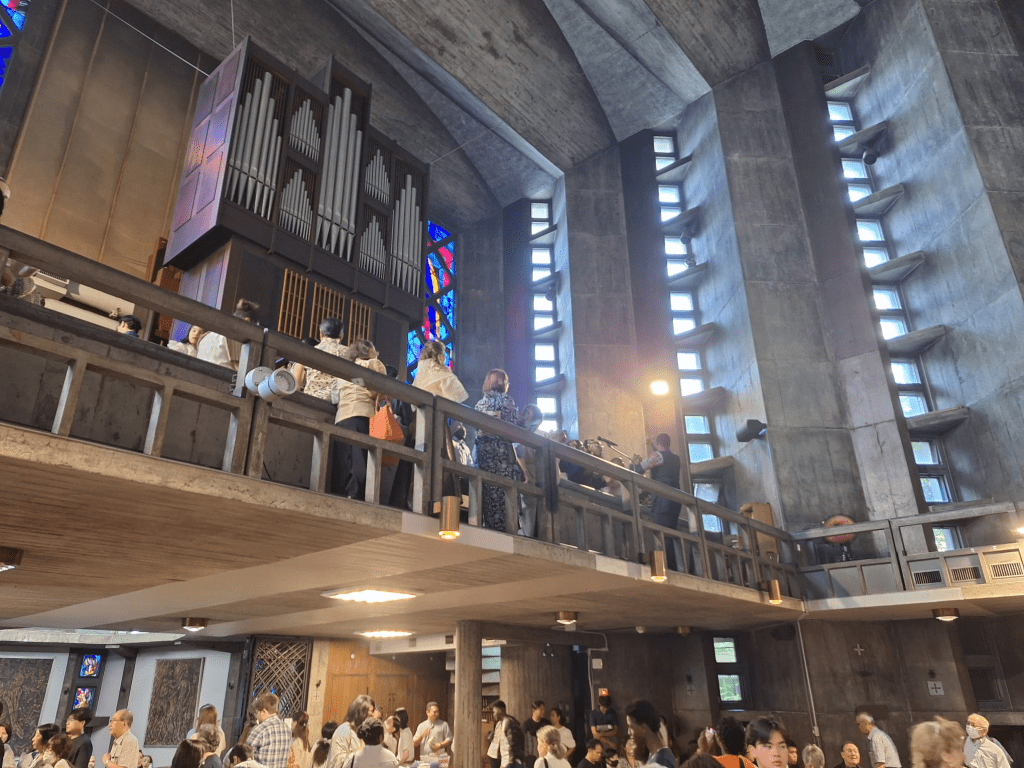 Doch ist das alles? Was ist mit der Kirchenmusik? Ich war an zwei Sonntagen hier in der katholischen Messe in Meguro (目黒). Ein Freund von mir hier kennt einen Priester aus dem Kongo, der dort am ersten Sonntag die Messe hielt. So passte das ganz gut zusammen, und ich musste nicht allein gehen. Inmitten von Tokyonesen, die es in ungewohnt lässiger Schlabbertracht (aber natürlich immer noch über die Maßen schick) zu Parks und Außenbezirken zum Müßiggang treibt, saß ich an zwei Sonntagen im schicken weißen Hemd schwitzend in der Yamanote-Linie nach Meguro. Der dort ansässige Pfarrer ist Mexikaner und spricht ein sehr schönes Japanisch (zumindest für meine Ohren). Die Gemeinde ist sehr international, mit Schwerpunkt auf Menschen aus Afrika (wohl viele von den Botschaften hier), auch viele Besucher von den Philippinen. Der Gesang ist daher wegen Unkenntnis der Lieder meist verhalten. Aber: Zumindest spielte eine Orgel, wenn auch etwas … zaghaft, zumindest bei der ersten Messe. Der Freund und einer seiner Bekannter, P. aus Indonesien, wollten danach Hamburger essen. Obwohl ich eigentlich nur Japanisch hier essen wollte, willigte ich ein, denn – ist nicht der japanische hambaga auch ein wenig 和食? Es lohnte sich und war vergnüglich. P. heiratet bald (eine Japanerin), und man merkte, dass es ihm guttat, über all die vielen Dinge zu reden, die hierfür zu erledigen sind: Hochzeit in Bali, wer zelebriert, welcher Familienname? Man drückt die Daumen.