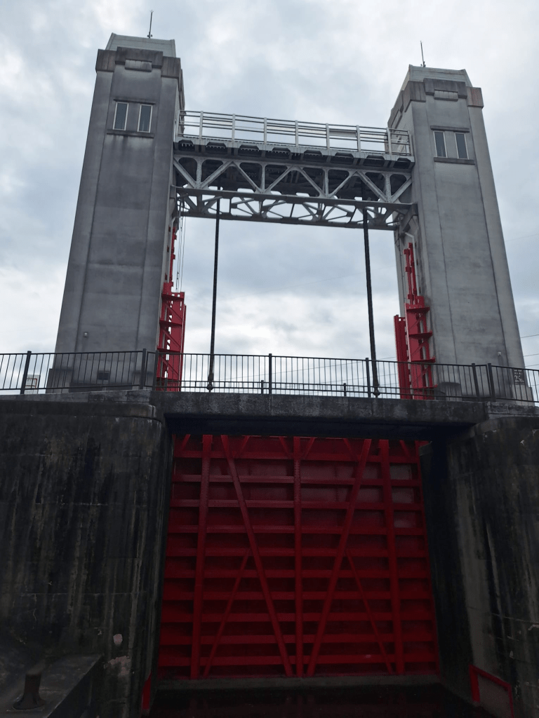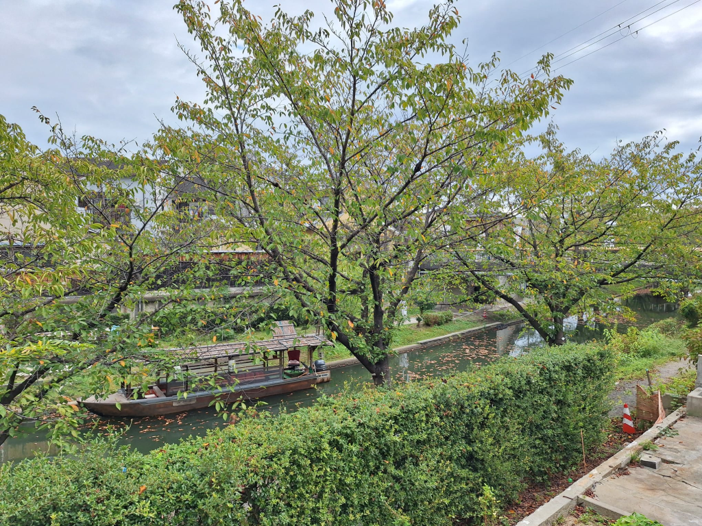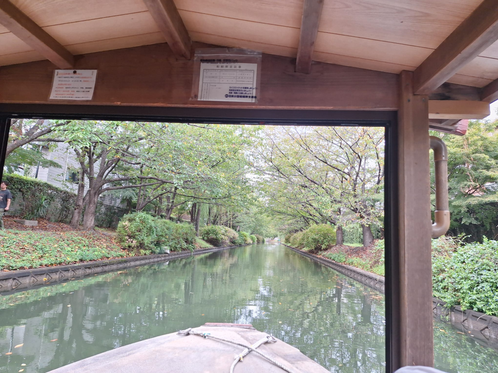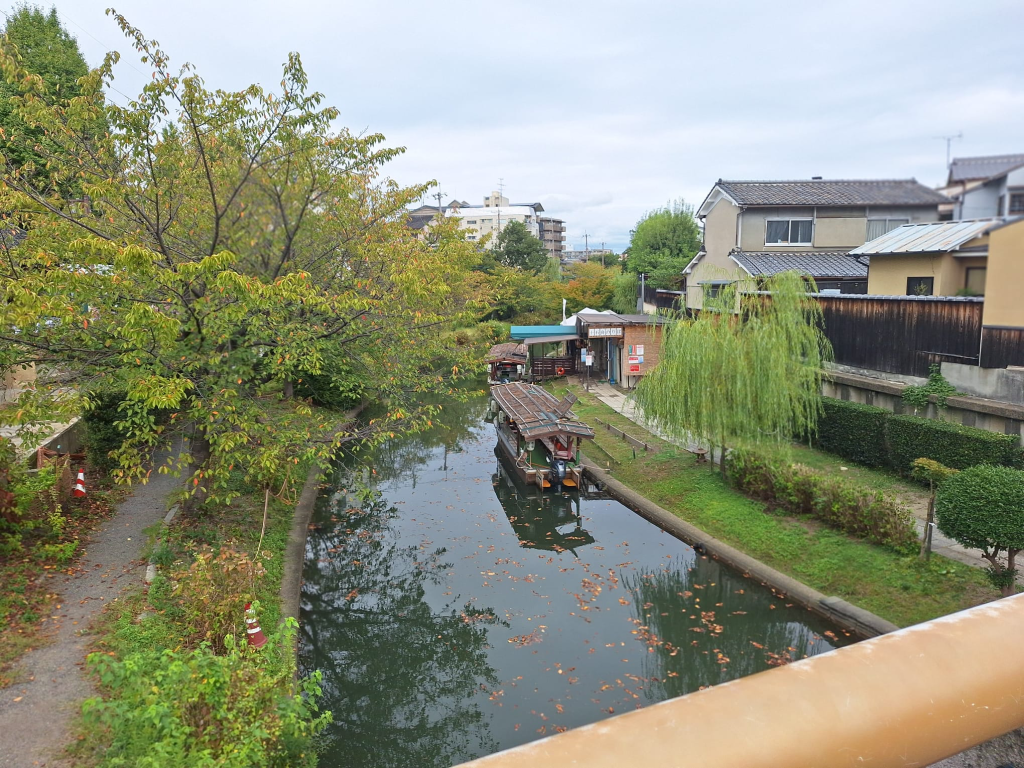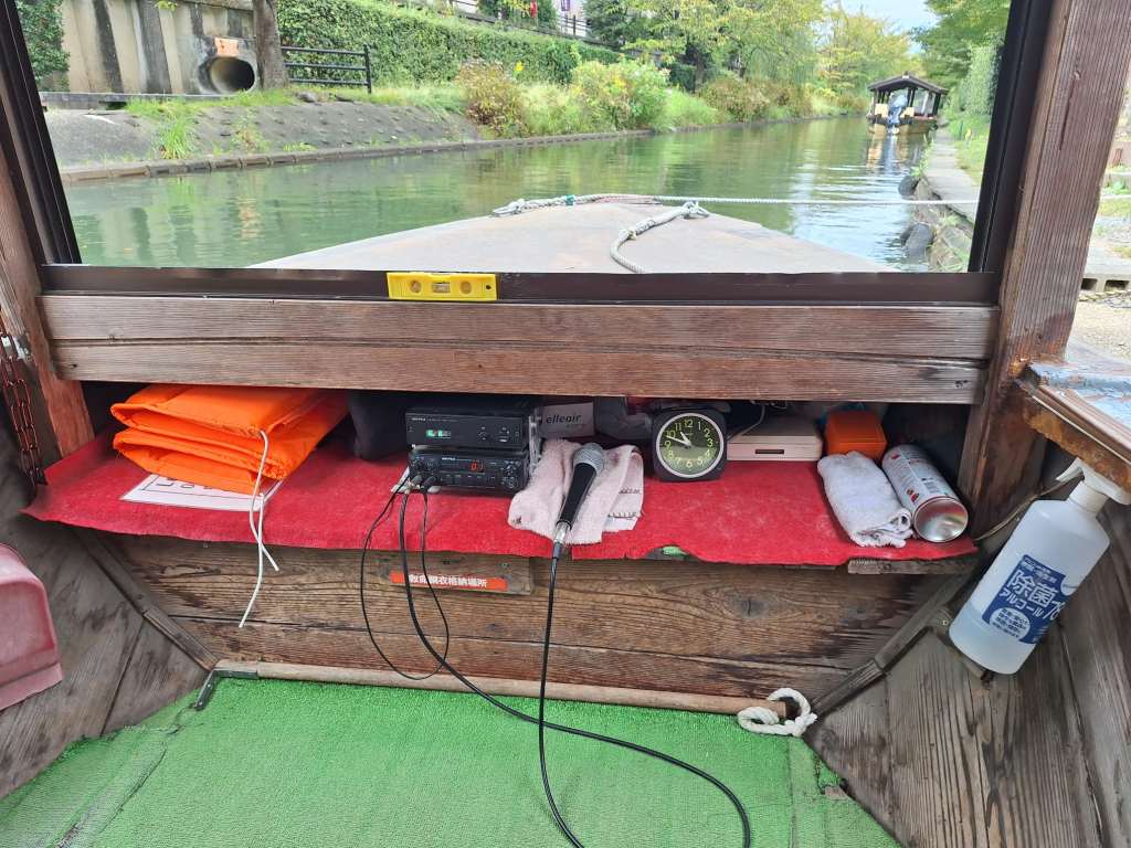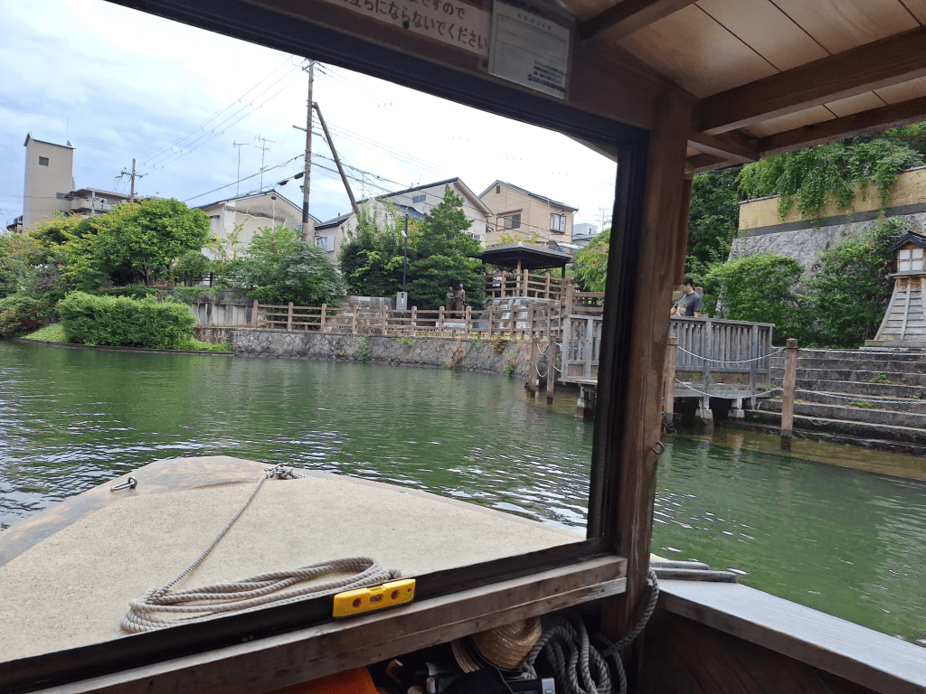 Der Moderator erläutert ab und an interessantes über sein Mikro, das ich nicht verstehe, zwischendurch wird typisch japanische Musik gespielt, und eine Dame mit hoher Stimme vom Band erläutert weiteres. Das wäre gar nicht nötig: Die Fahrt erfrischt durch eine sanfte Brise, es ist entspannend und 気持ちい, an Weiden vorbei durch Kyoto zu fahren. An einer Schleuse machen wir halt, und Nさん und ich besichtigen ein kleines Museum.