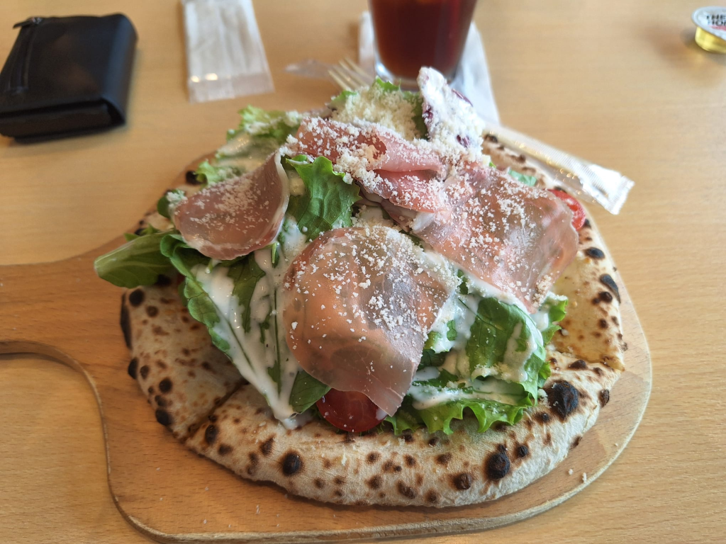 Wir sputen uns, um rechtzeitig zum Kyogen nach 東大阪 zu kommen, Nさん hat Karten besorgt. Kyogen ist eine Art humoristischer Bruder von Kabuki, also japanisches Theater, nicht ganz unverwandt zum deutschen Lustspiel. Wir kommen rechtzeitig, und lassen uns im Restaurant des Kulturzentrums Pizza schmecken. Ich denke an meine Figur und ordere „Salatpizza“. Und ich bekomme genau das: Salat auf Pizzateig. Das Verspeisen ist schwierig, aber sie schmeckt, und ich bin stolz, auf meine Linie geachtet zu haben. Und ich bin auch stolz, endlich einmal etwas bezahlen können zu dürfen.