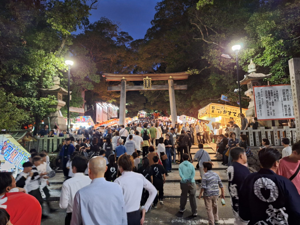 Es ist schon Nachmittag, bald wird die Sonne untergehen. Nさん sagt, dass es noch ein Matsuri, ein japanisches Fest an einem Schrein gibt. Ich mag Matsuris, aber ich weiß nicht, ob sie schon erschöpft ist, versuche, das durch Fragen herauszufinden. Doch sie meint „行きましょう“, lass uns hingehen. Wir verlassen 東大阪 und steigen in die Bahn. Wir wechseln öfters den Zug, und immer mehr Menschen steigen zu. Bald steigen wir mit einer großen Menschentraube aus, Kind und Kegel, viele in Matsurikleidung, Kimono oder speziellen Kitteln. Besonders niedlich bei den Kindern, die freudig aufgeregt, aber nicht schreiend zum Fest strömen. Selbst in solchen Menschenmengen zeigt sich die japanische Veranlagung zur Disziplin. Man weicht aus. Ich merke aber, dass diese großen Menschenmassen nicht ganz Nさん’s Welt sind. Wir steigen den Hügel hinauf, auf dem der Schrein steht, Menschen überall, die kleinen 屋台, Verkaufsbuden mit Leckereien.