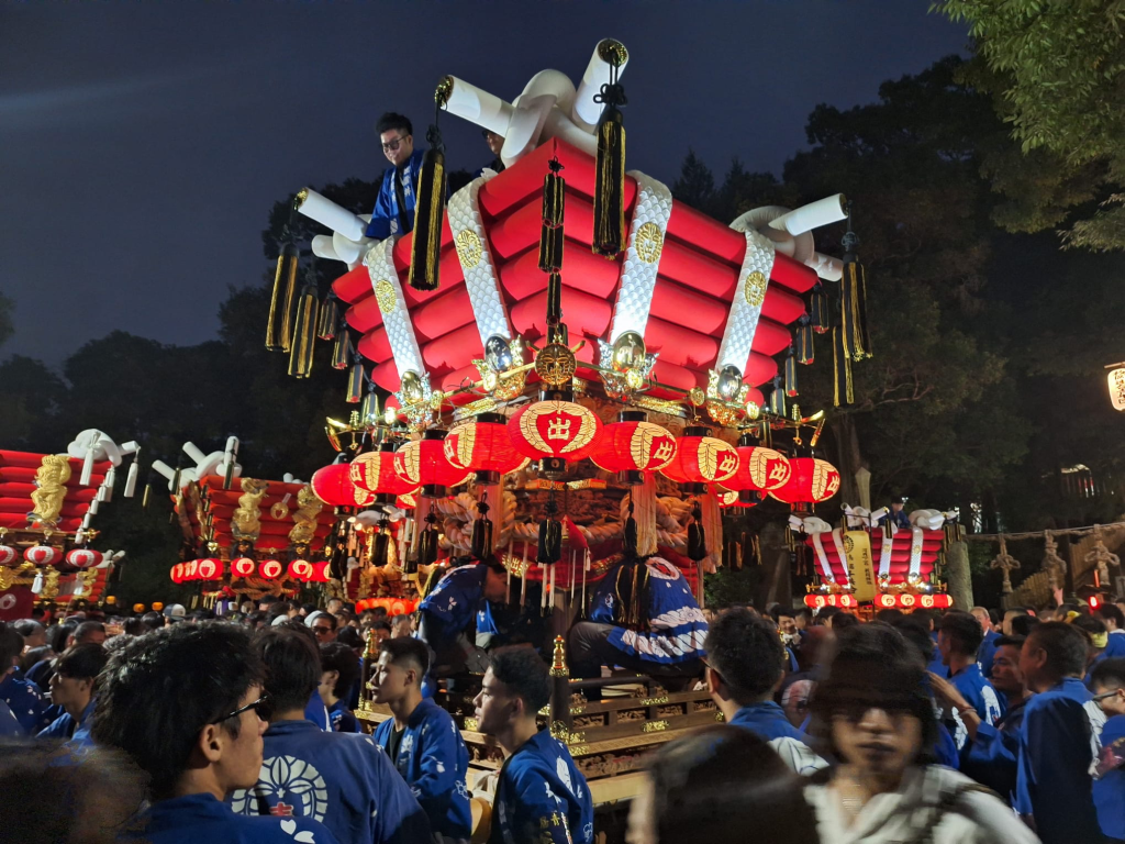 Hier stehen die Mikoshi, kleine, tragbare Schreine. Nun ja, klein ist wie immer relativ. Jeder Stadteil hat normalerweise einen solchen Mikoshi. Die Jungs und Mädels in Blau um den Mikoshi herum gehören zu dem jeweiligen Stadteil, und sind dazu auserkoren, den tragbaren Schrein unter lautem Kampfgetön durch die Gegend zu tragen – hier vom Hügel hinunter und wieder hoch. Es ähnelt einer Mischung zwischen Karneval und Prozession. Nur noch etwas ausgelassener – aber disziplinierter.