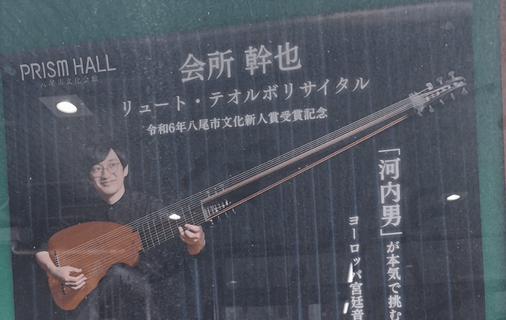 Wir besorgen uns Kaffee im Bahnhofs-コンビニ. Mir fällt auf: Die Menschen in Kansai haben einen etwas dunkleren Hautton als viele Tokyoter. Letztere achten darauf, keinen Sonnenstrahl an die Haut zu lassen, u.a., weil diese Falten verursachen könnte. Aber ich muss zugeben, dass etwas Farbe keineswegs von Nachteil sein muss. Nさん zeigt mir ein Plakat. „Das war mein Schüler“. Ein junger Mann mit einer Theorbe lächelt dort, er gibt ein Konzert in seiner Heimat, gerade lebt er in Deutschland. Beeindruckt notiere ich mir den Namen des Lautenisten, der vor allem auch klassische Gitarre spielt.