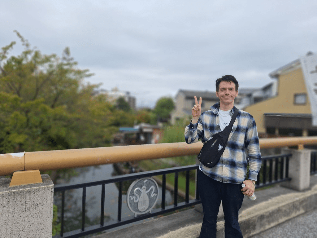 Das hochwertige, sanfte Wasser der Kyoto-Ebene gibt dem Reiswein die Eleganz und Güte. Diese Kostbarkeit wurde in alter Zeit mit prachtvollen Booten ins ganze Land transportiert. Dies ist einer der Gründe, warum Fushimi von einem System von Kanälen durchzogen ist. Zunächst werden Karten für eine Bootstour erstanden (wieder schaffe ich es nicht, zum Bezahlen durchzukommen). Diese etwas zerknitterte, aufgequollene Gestalt hier zeigt den Autor am Wasser.