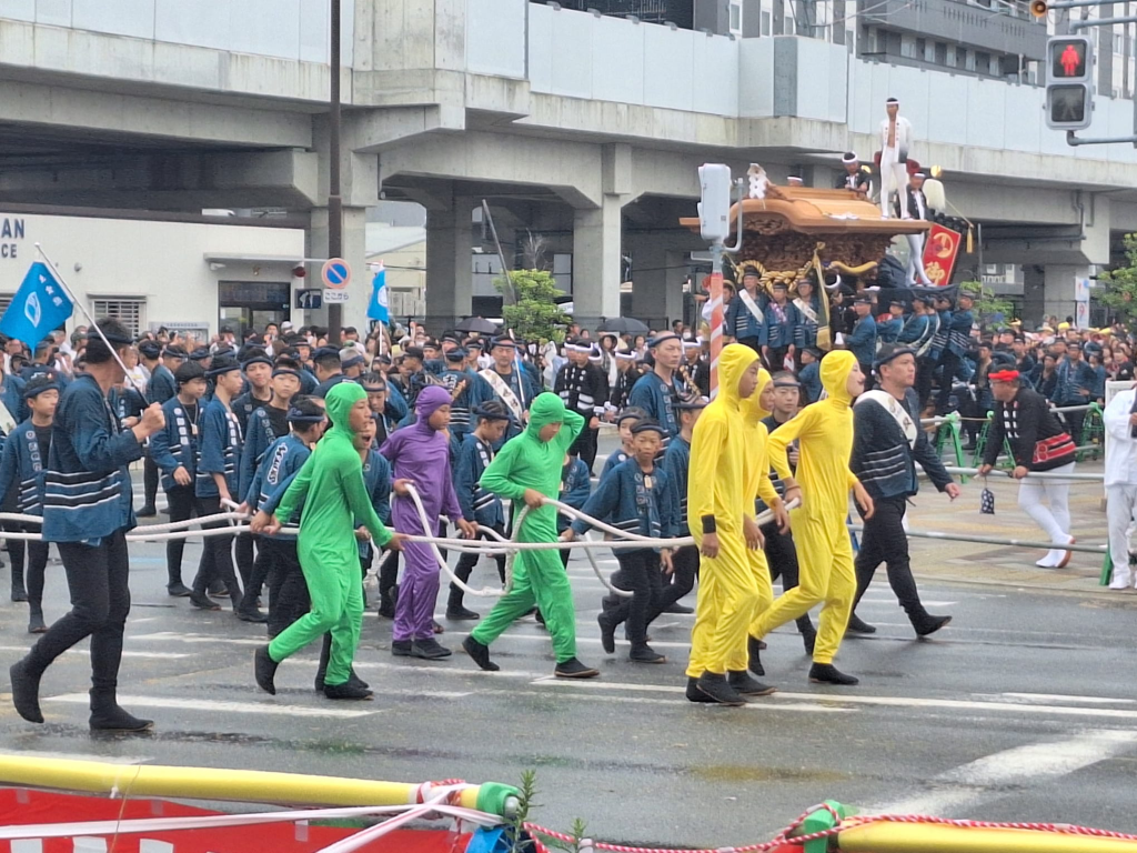 Ich staune über die Menschenmassen, viele in der traditionellen Matsurikleidung, auf dem der Namen ihrer Stadt als Kanji prangt. Kind und Kegel sind dabei, goldig, die kleinen Knirpse und Mädels, die mit Feuereifer dabei sind. Wir entdecken auch Stilblüten unter den Kostümen, die Stadteile wollen sich natürlich gegenseitig ausstechen. Von Expo-Maskottchen zu amerikanischen GIs (アメリカ村?) ist alles vertreten. Ich finde die geschminkten Jungs im Maidkostüm am gelungensten.