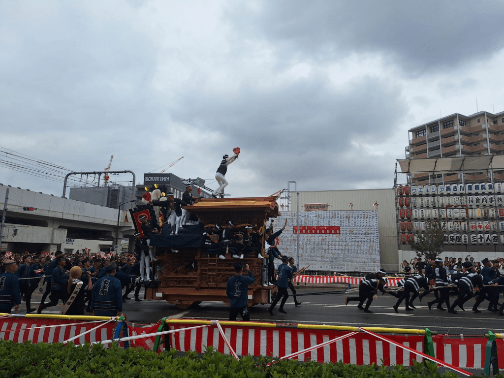 Der Ablauf ist simpel: Die nächste Gruppe wartet, bis sie das Zeichen zum Start erhält, immer begleitet von Flöten und Trommeln. Dann beschleunigen die Seilträger, und der Danjiri rast in einem Affenzahn um die Ecke – darauf die waghalsigen Danjiri-Fahrer, die der Fliehkraft trotzen, und unter frenetischem Applaus.