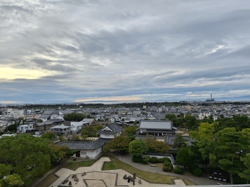 Tさん wartet auf uns, in strahlender gelber Jacke. Das finde ich sympathisch, das sticht ein wenig heraus. Sie hat gleich zwei Schirme mitgebracht – vorsorglich, der Wetterkami weint heute ab und an. Ich verneige mich und mache die kurze 自己紹介. Ich merke, dass Tさん eine resolute Persönlichkeit ist. Sie lernt auch Deutsch, scheint aber nicht so gerne Deutsch zu sprechen. Die Damen plaudern etwas, ich verstehe wenig, aber das passt: es gibt viel zu sehen um mich herum, und ich freue mich, dass Nさん ein Weilchen in natürlichem Tempo sprechen kann. Wir sprechen über Burgen (Tさん sammelt Burgstempel, und möchte alle 200 Burgen in Japan besuchen – 頑張って), und Verschwörungstheorien über in größerer Anzahl ablebender AFD-Politiker im Osten Deutschlands (wovon ich zuvor noch nie etwas gehört hatte). Tさん reicht mir plötzlich eine Foto-Broschüre – ihre Tochter hat vor kurzem geheiratet. In Kyoto. Traditionelle, japanische Hochzeit im Shinto-Schrein. Ich staune über wundervolle Bilder, die Braut im Kimono, der Bräutigam im eleganten japanischen Festgewand. Fröhliche Gesichter, wohin man schaut. Herrliche Bilder. Tさん, so erfahre ich später, hat die Tochter vom Kleinkindalter an alleine aufgezogen und für sie gesorgt.