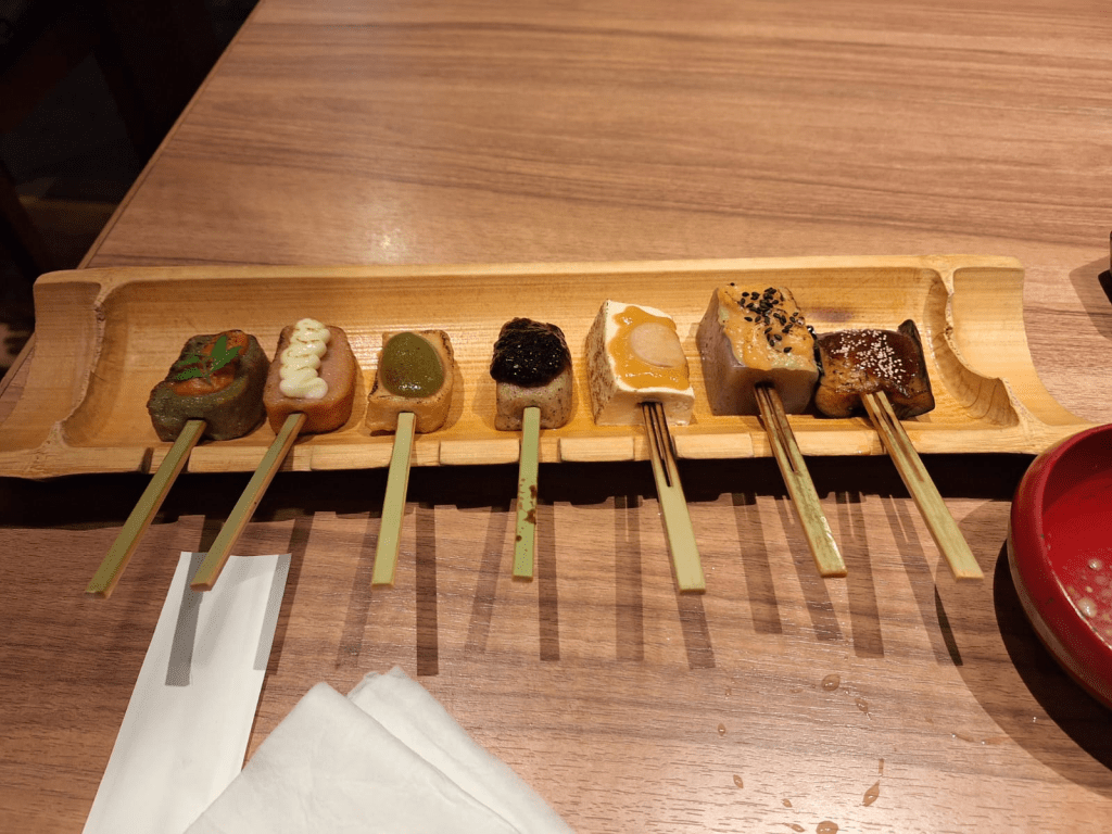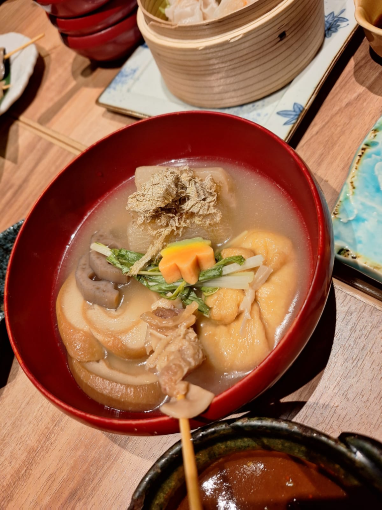 Zum Abendessen führt uns Tさん in ein Izakaya, eine Mischung aus Restaurant und Kneipe, sehr beliebt in Japan. Vieles auf der Karte kenne ich nicht, wir bestellen kreuz und quer. Die Damen loben die Bedienung und plaudern mit ihr. Das Mädel ist sehr groß, blondgefärbte Haare, und wohl im ersten Semester an der Uni, Hauptfach Schauspiel, und hat sogar Deutsch gelernt in der Schule, davon sei aber nichts mehr da. Ich sage, dass die 制服 (Uniform) 可愛い (niedlich) sei, und werde prompt von Tさん getadelt: Nicht nur die Uniform, das ganze Mädchen sei 可愛い! Ich schmunzle. Nさん und Tさん bestellen wunderbares, ich freue mich über Highball 1, 2 und 3, während Tさん sich auf den Weißwein konzentriert. Es ist selten der Fall, aber alles, was ich esse, ist absolut köstlich. Von dem gegrillten Fleisch zum Oden (Eintopf) bis hin zu den kleinen Spießen mit allerlei Sojahaltigem. 気持ちいい。