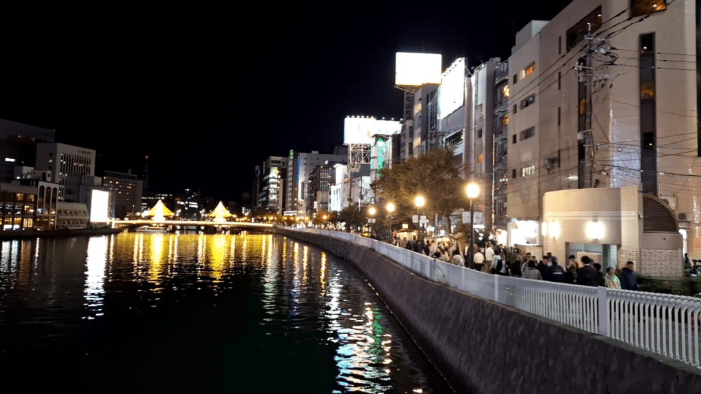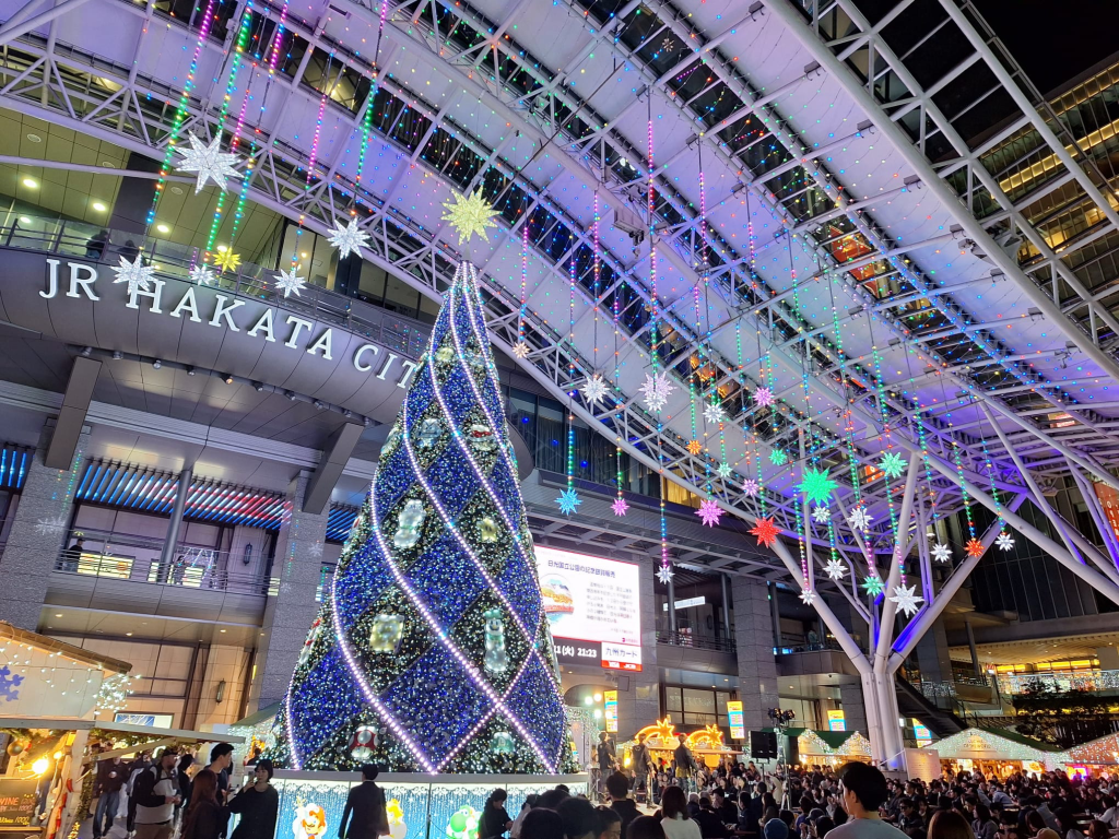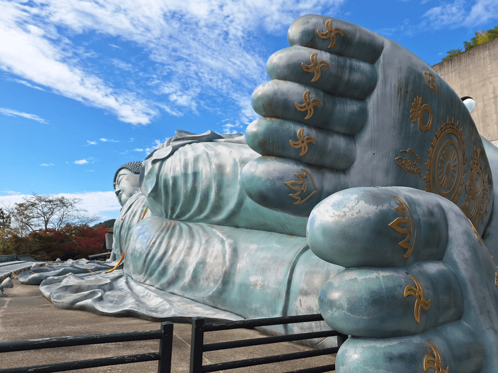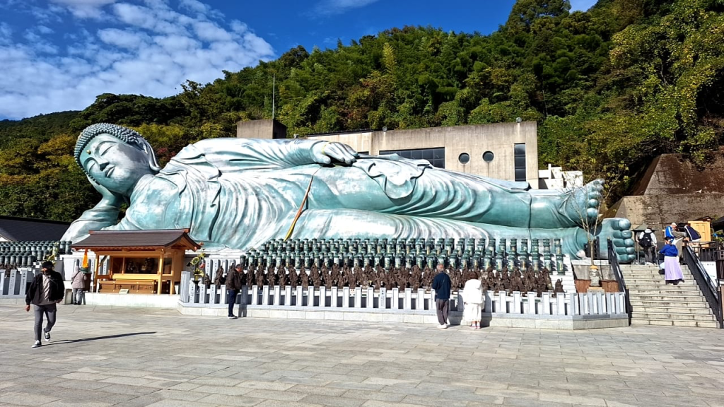 Schwerpunkt der Reise ist aber Kyushu. Die Insel, die südlich an die Hauptinsel Honshu anschließt. Wir besuchen Fukuoka, dort gibt es hervorragenden Tonkotsu-Ramen, Illuminationen, eine schöne Flußpromenade mit Streetfood, die Hauptfiliale von Ichiran-Ramen, in der Umgebung einen wundervollen, monumentalen liegenden Buddha, und den Schluß ziert ein (viel zu früher) Weihnachtsmarkt: