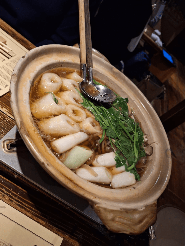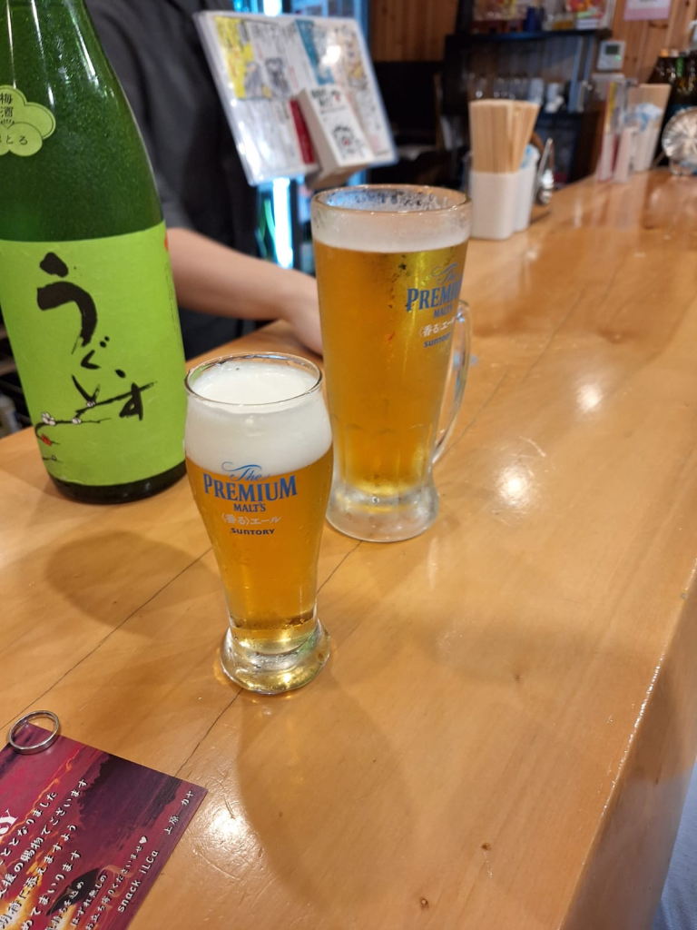 Wir besuchen eine gemütliche Stehkneipe in Kumamoto, sogar zwei mal (https://www.instagram.com/stand_shogiku/). Der nette junge Bartender serviert auch Oden, japanischen Eintopf, und bietet hervorragenden Sake an. Dieser ist nicht im Bild, nur mein Miniatur-Bierchen neben C’s normalem: